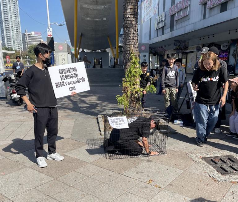 為揭露蛋業中母雞長期遭囚禁的殘酷現實,國際動物保護組織善待動物組織(PETA)5日於高雄中央公園捷運站外舉辦行動示威,邀請民眾自願進入仿照蛋雞籠打造的狹小空間中停留 1 分鐘,並獲得新台幣 50 元,透過親身體驗,感受蛋雞一生被剝奪自由的處境。