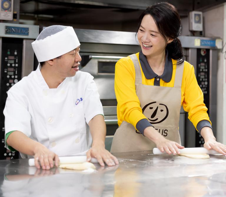▲公益大使曾寶儀走進喜憨兒庇護工場,與憨兒夥伴一同參與烘焙實作,以行動支持「高速傳愛助學計畫」。(圖/喜憨兒基金會提供)。