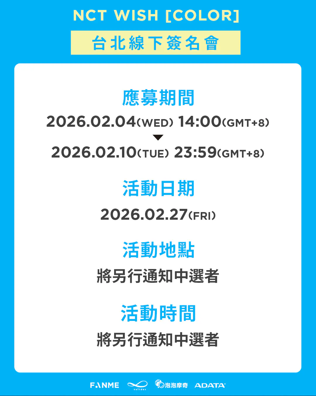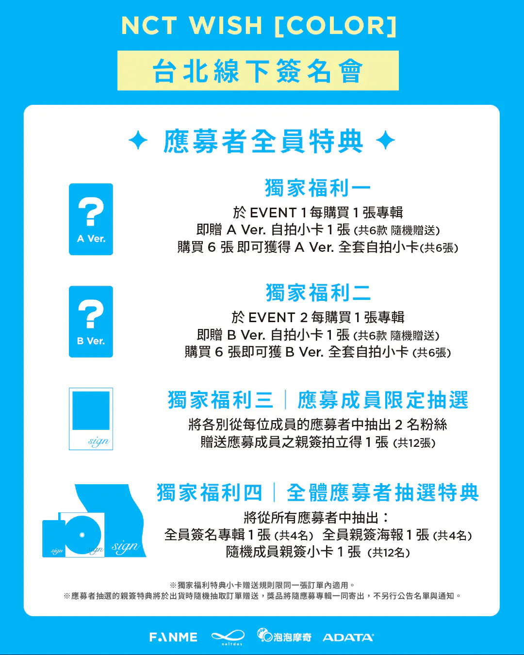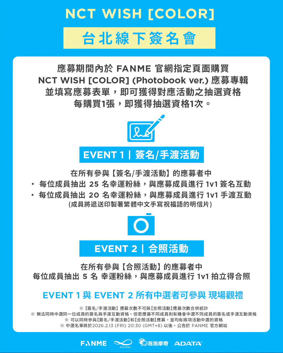 「NCT WISH《COLOR》台北線下簽名會」採取線上應募抽選制,規劃多項近距離交流內容讓粉絲能更深刻感受成員魅力。活動形式包含每位成員將抽選 25 名粉絲進行一對一簽名互動,另抽選 20 名粉絲參與一對一手渡明信片活動,以及 限量 5 名名額進行合照,讓幸運粉絲留下難得的珍貴紀念;此外本次應募亦準備多項限定福利回饋粉絲,包含 FANME 獨家特典自拍小卡,以及限量親簽拍立得、小卡、專輯與海報等收藏級好禮, FANME也溫馨提醒,完成專輯訂購後務必填寫指定的 Google 應募表單,方能取得抽選資格,中選名單將依官方通知為準。敬請把握與成員近距離春日互動的珍貴機會,刻畫成青春裡最燦爛的 COLOR。