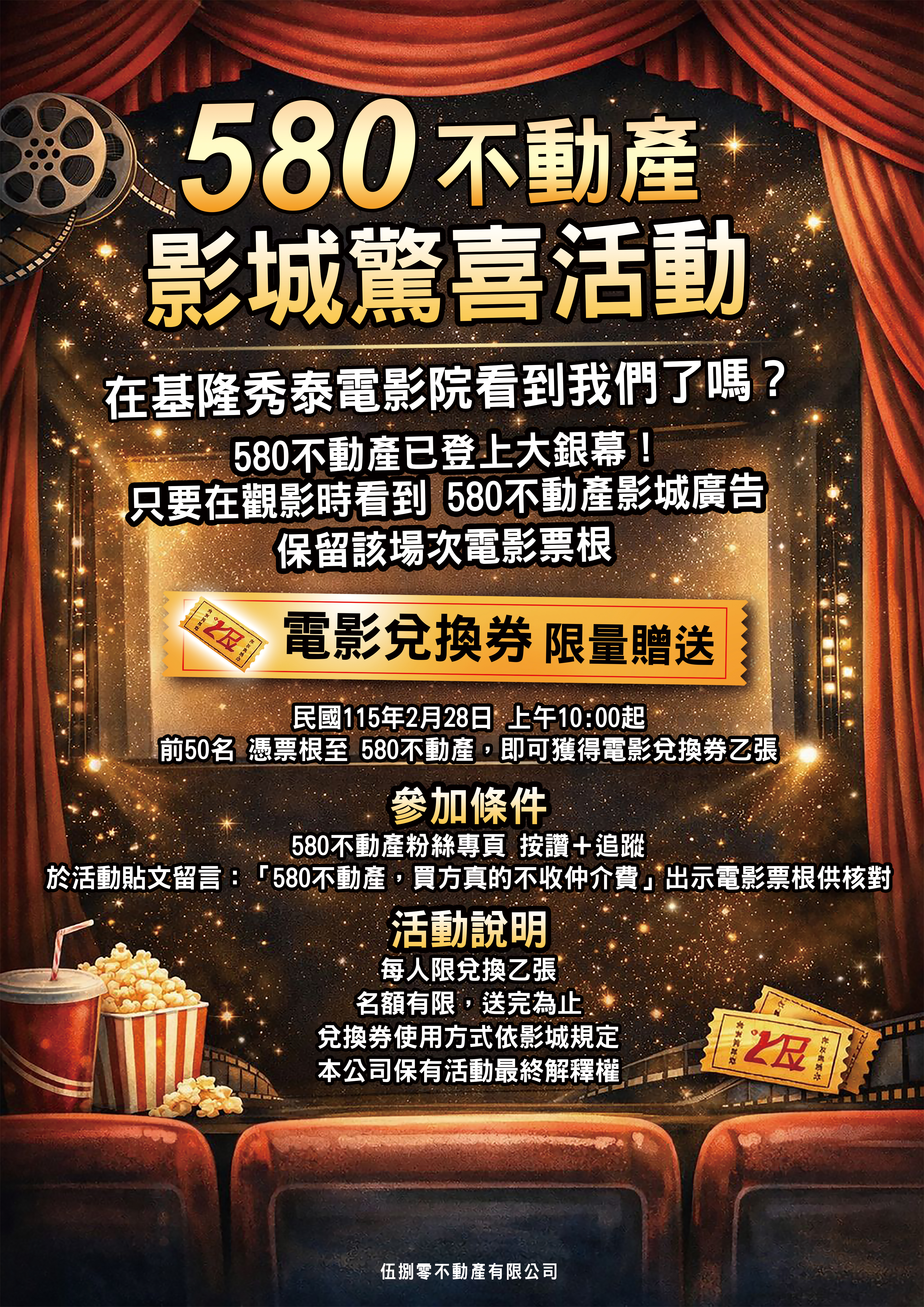 580不動產表示,自民國115年2月28日上午10點起,前50名持電影票根至580不動產門市,完成粉絲專頁按讚追蹤、留言指定活動內容並出示票根,即可獲得電影兌換券乙張,送完為止,每人限領一張。