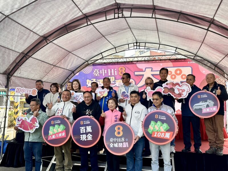 「台中Hi8 全城開趴」活動熱度持續攀升!自去年12月26日開跑,截至今年2月6日止,累積消費登錄金額已突破新台幣129億元,展現台中強勁的消費動能。迎接農曆春節,台中市政府經濟發展局今(8)日於大甲商圈舉辦「台中Hi8 好運迎春在大甲」抽獎活動,由副市長鄭照新與現場貴賓共同抽出108萬元現金壓軸大獎,幸運得主為來自大雅區的陳先生。