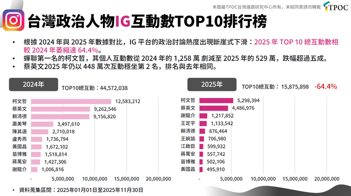 觀察IG平台可發現,2024年至2025年的數據顯示政治討論熱度出現明顯斷崖式下滑,TOP 10總互動數較前年萎縮64.4%。蟬聯第一名的柯文哲,個人互動數亦從2024年的1,258萬大幅降至529萬,跌幅超過五成。前總統蔡英文則以448萬次互動排在第2名,排名與去年持平,但互動數跌幅也接近五成,顯示IG平台的政治互動熱度整體降溫。