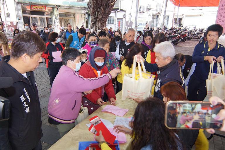 ▲樂成宮轄內弱勢家庭排隊領取物資,今年共有5019戶受惠。(圖╱記者孔亮云翻攝)