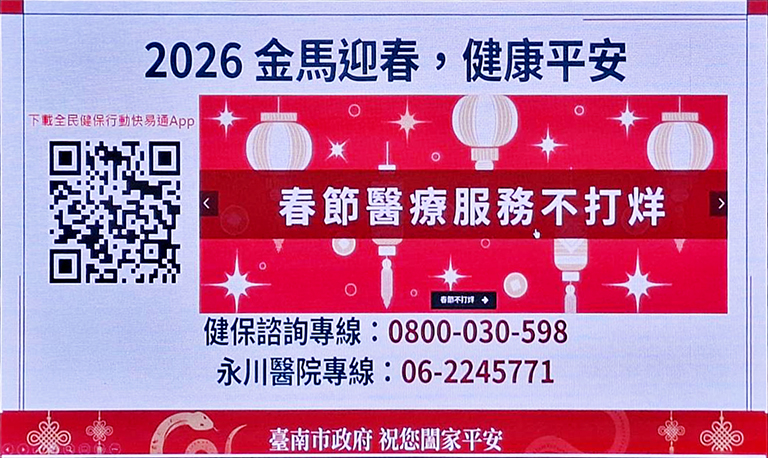 春節將至,為讓市民朋友在團圓時刻也能享有安心的醫療服務,台南市政府今(9)日於永華市政中心舉辦記者會,由副秘書長林榮川代表市長黃偉哲宣布全面啟動「春節醫療量能整備專案」,春節期間全市醫療服務不打烊,除夕至初三期間共有超過1,700家次醫療院所及特約藥局提供服務,並透過「醫療分流」與「即時監測」機制,確保急重症醫療照護不中斷,讓市民平安健康過好年。
