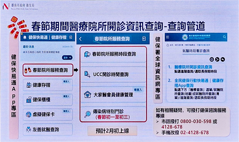 另外,為方便民眾查詢春節開診資訊,市民可透過利用手機查詢,下載「全民健保行動快易通|健康存摺」APP,進入「醫療查詢」>「就醫院所查詢」,即可用地圖查看附近的開診院所,或者也可運用網站查詢,至健保署首頁>健保醫療服務>院所查詢>服務時段(連結:https://info.nhi.gov.tw/INAE1000/INAE1000S01)進入網站後點選「進階查詢」並勾選看診日期與縣市區域,即可避免白跑一趟。
