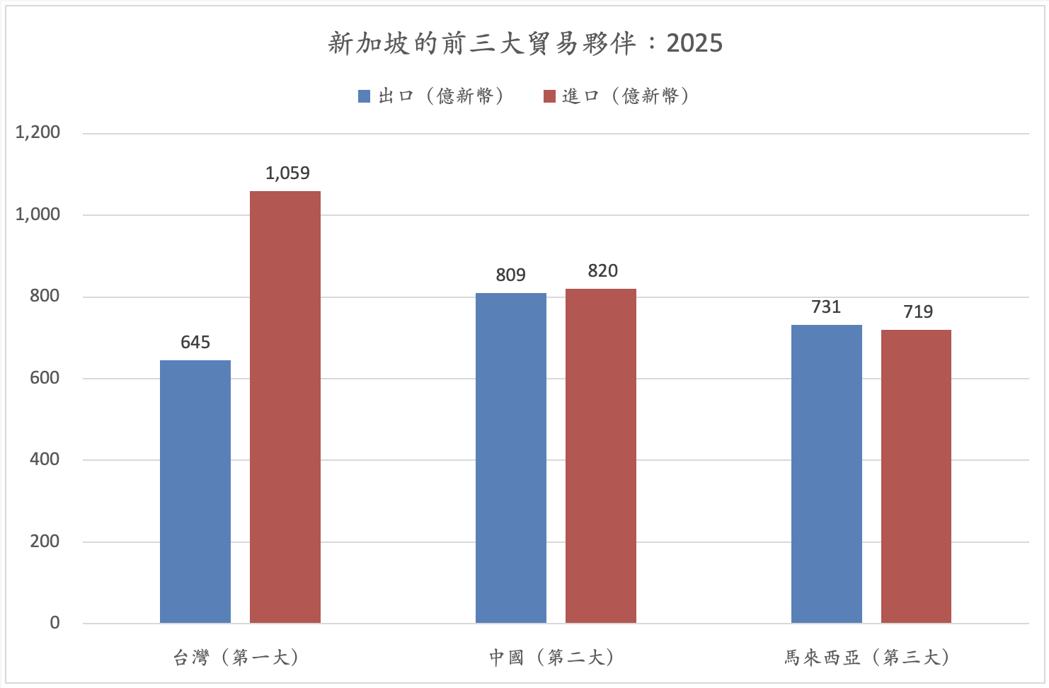 從整體數據觀察,2025 年新加坡與台灣的雙邊商品貿易總額約為 1,704 億新幣,高於同期新加坡與中國的 1,629 億新幣,以及與馬來西亞的 1,450 億新幣。進一步分析可見,這並非單向成長,而是進出口雙向擴大的結果。當年新加坡對台灣出口約 645 億新幣,自台灣進口則達 1,059 億新幣,使台灣成為新加坡最大的單一進口來源。