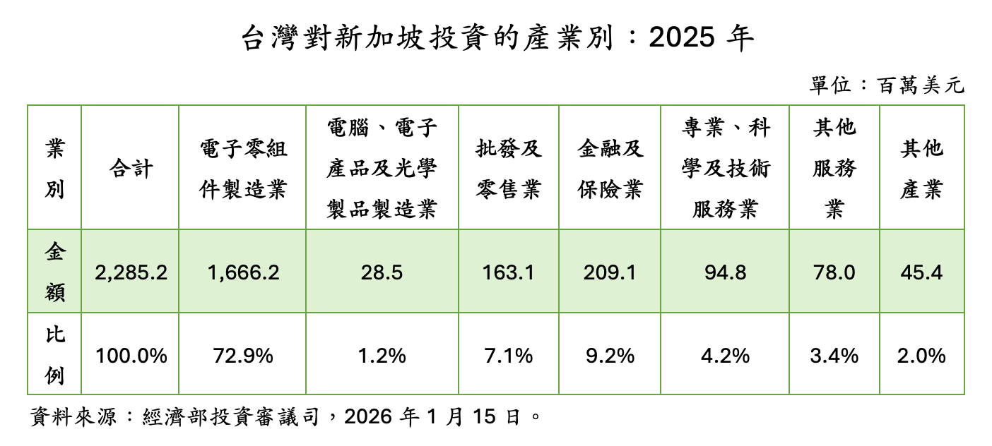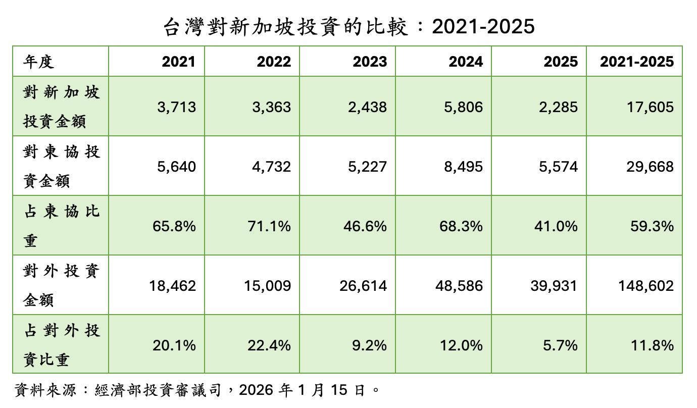 從整體結構觀察,2025年台灣對新加坡投資占台灣對外投資的5.7%,並占對東協投資的41%。若以2021至2025年合計計算,台灣對新加坡投資總額達176億美元,占台灣對東協投資的59.3%,亦占對外投資總額的11.8%,顯示新加坡已成為台灣資金進入東協乃至全球市場的重要節點。