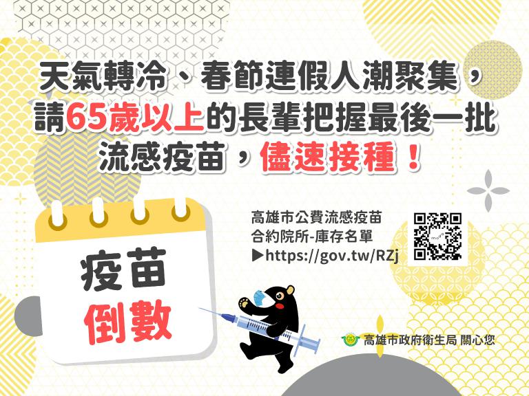 農曆春節假期即將到來,南來北往頻繁,加上天氣濕冷,流感及腹瀉等傳染風險增加,高雄市政府衛生局今(10)日提醒,高雄市公費流感疫苗最後一批調配到貨僅餘約一千劑,呼籲高風險族群市民儘快於年前完成接種。此外為確保民眾春節期間就醫需求,衛生局與轄內各級醫療機構完成量能整備,除全天候不中斷急診,另於春節期間加開傳染病特別門診,避免急診壅塞,落實分級醫療,讓民眾安心過好年。