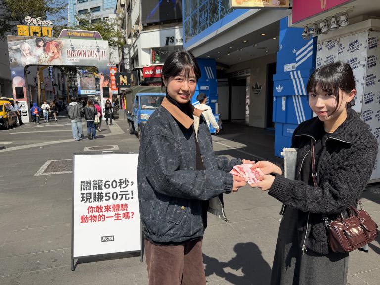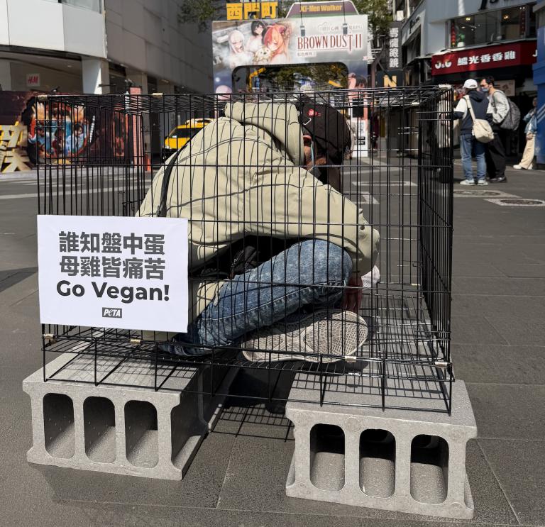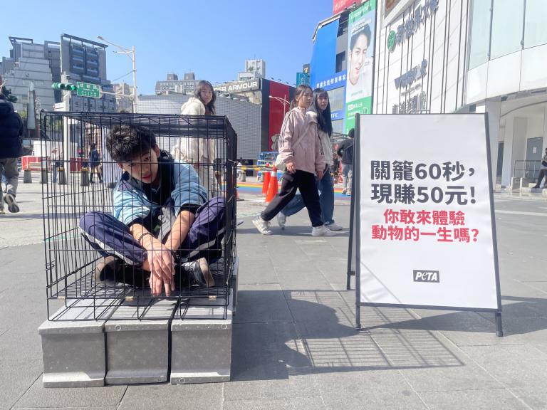 善待動物組織(PETA)今(10)日於台北西門町舉辦「籠中體驗」快閃行動,邀請民眾進入模擬蛋雞飼養環境的鐵籠中,實際感受動物在狹小空間內長期被囚禁的處境,藉此引發社會對蛋雞籠養制度的關注。