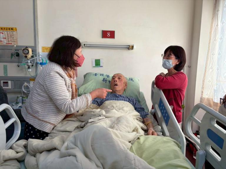服務團隊探視吳伯伯時,吳伯伯正處於睡眠休息狀態,白主任為避免驚擾他靜養,特別放低音量向醫護人員詢問其飲食及睡眠情形,並叮囑隨行人員在春節期間需持續追蹤吳伯伯的恢復動態,確保長輩能在安定的環境中逐步康復。