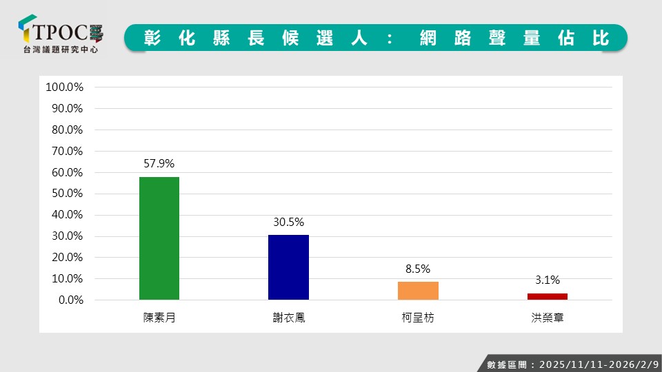民進黨日前正式拍板2026彰化縣長候選人,由立委陳素月代表出征。相較之下,國民黨至今仍未敲定最終人選,潛在人選包括前縣議長謝衣鳳、前立委柯呈枋及前副縣長洪榮章。TPOC台灣議題研究中心透過QuickseeK快析輿情資料庫,蒐集近一季網路數據分析發現,在網路聲量與討論熱度上,陳素月與謝衣鳳形成主要對決焦點;但就好感度表現來看,謝衣鳳的「豪宅風波」與家族爭議帶來不少負評,使其好感度表現居末。