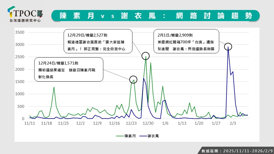由於陳素月與謝衣鳳掌握多數的選情聲量,進一步分析兩人近三個月的聲量走勢,發現12月下旬至1月初開始出現幾波高峰起伏。首先,綠營內部初選期間,陳素月獲得提名,引發同樣有意參選的邱建富不滿,並一度揚言脫黨參選,討論聲量一度升至1,571則。12月底副總統賴清德出席彰化活動時與謝衣鳳同框,卻當場呼籲民眾「力挺陳素月」,這種戲劇化的對比再度引發2,527則討論。今年2月初,謝衣鳳的弟弟謝典霖發布「謝家豪宅」開箱影片,為謝衣鳳帶來另一波聲量高峰,討論數達2,909則。不過,由於謝典霖本身正競逐彰化縣議長連任,此舉也牽扯到家族糾紛,被外界視為「姊弟鬩牆」,進一步引發網友熱烈議論。