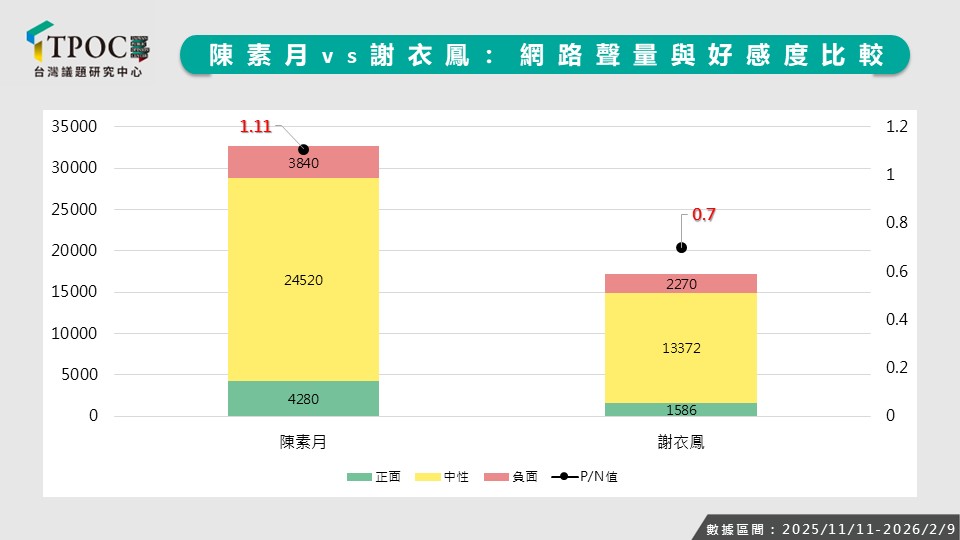 從網路影響力與話題掌握來看,陳素月仍佔據相對優勢,反觀藍營聲勢最高的謝衣鳳,其網路討論多集中於豪宅爭議與家族相關議題,負面話題佔比偏高。正如國民黨主席鄭麗文所言,彰化仍缺乏「高度期待的候選人」。與柯呈枋、洪榮章相比,謝衣鳳需額外承擔家族議題所帶來的輿情成本,在議題布局與形象經營上面臨更多壓力。在藍營人選尚未定錨之際,如何化解並避免家族問題成為競爭對手的攻擊焦點,將是後續的觀察重點。