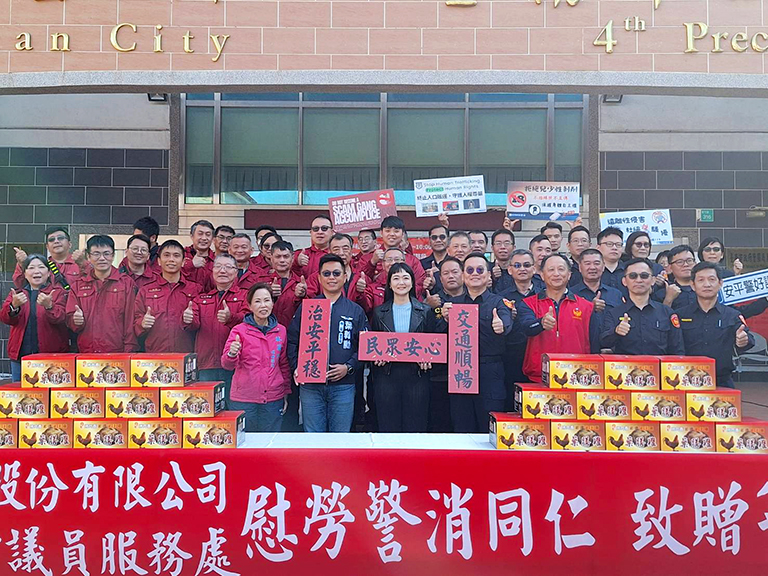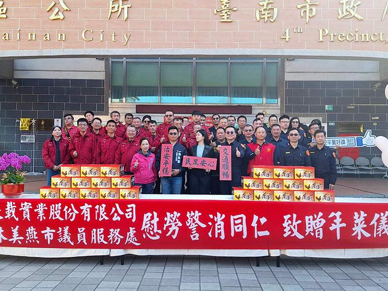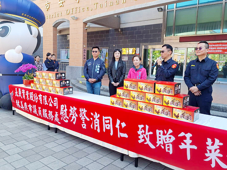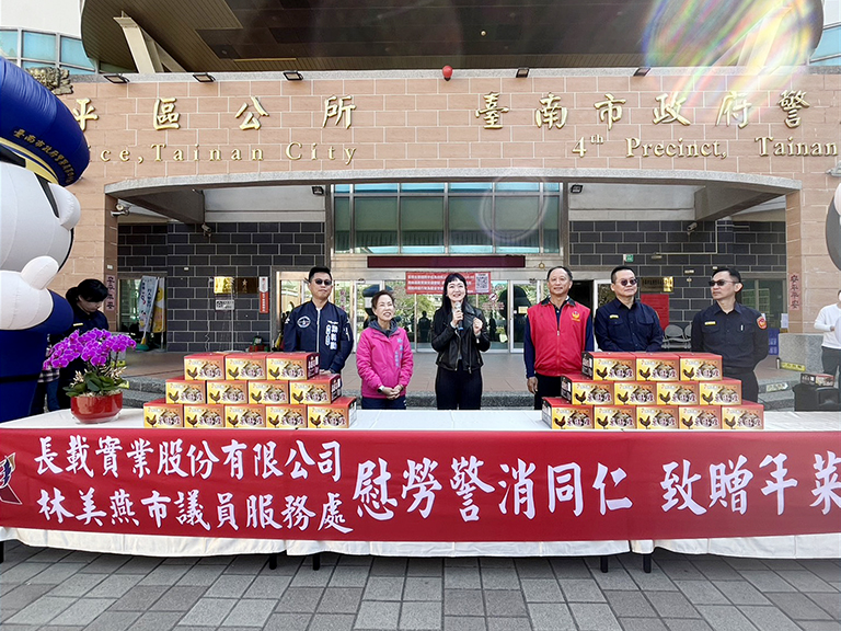 警察、消防人員在年節仍需輪班值勤,台南市議員林美燕持續11年結合商界人士,捐贈年菜,讓警消夥伴仍可在崗位上享受過節的歡樂氣氛,今年由長裁實業股份有限公司贊助4百餘份,12日在警四分局舉行公開捐贈儀式,各受贈單位都欣喜表示,警消同仁感受到社會各界的愛心,更能在春節期間專心守護民眾的公共安全。