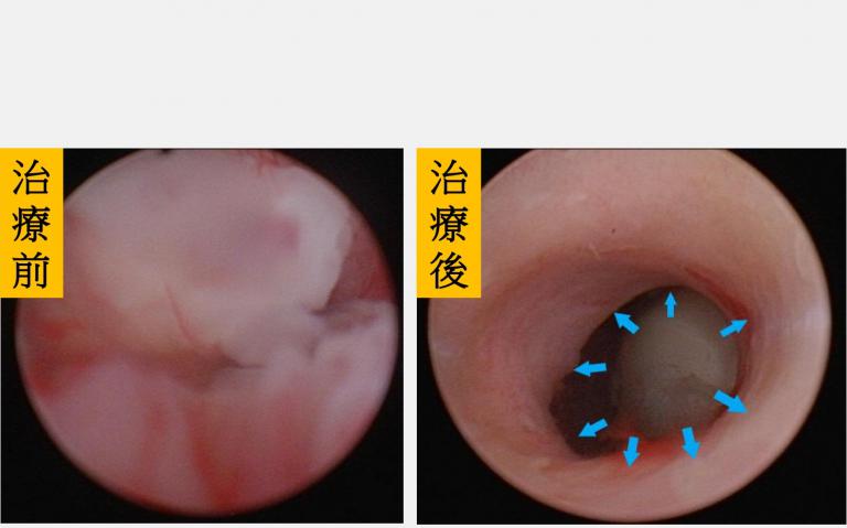 ▲【左圖】:術前內視鏡發現尿道完全被腫瘤阻塞;【右圖】:治療後內視鏡已無看到腫瘤(中間圓球為導尿管)。(圖╱仁愛長庚醫院提供)