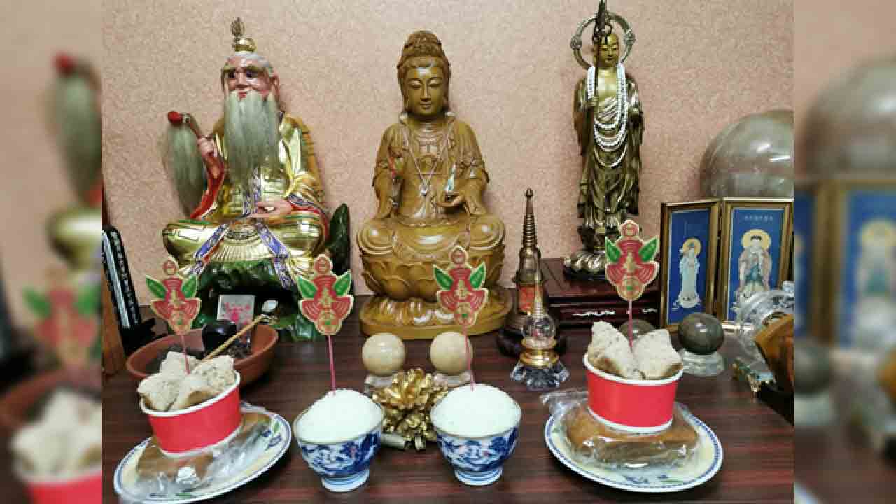 ↑圖說:神明前及公媽靈前,供年粿、發糕、春飯(飯上插春字剪紙、紙花,紙花又叫春仔花、飯春花,「春」諧音「剩」,有歲月餘糧,年年食不盡的吉祥意)。(圖片來源:楊登嵙教授提供)