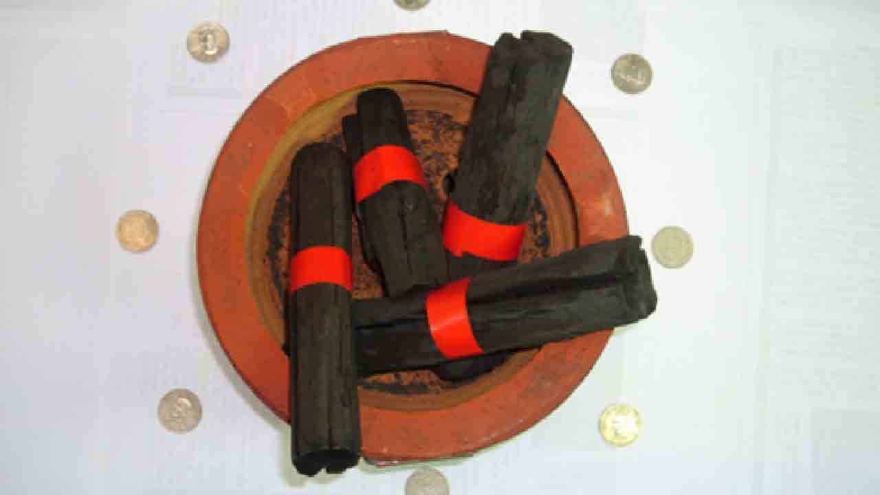 ↑圖說:大年夜的團圓夜飯稱為圍爐,桌下放置一個火爐(烘爐),火爐的四週可多擺8枚錢幣,代表「財運興旺」,能夠招來好運氣。(圖片來源:楊登嵙教授提供)