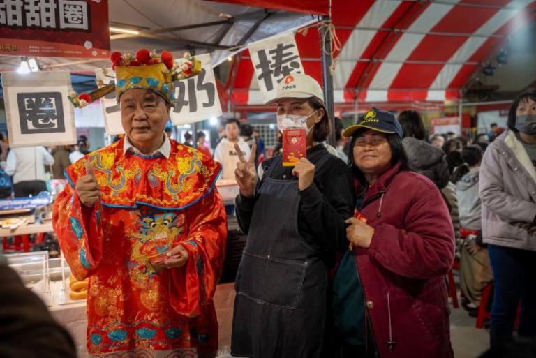 ▲民眾拿到裝扮成「財神爺」和美鎮長林庚壬發放的限量「一元復始」招財紅包喜出望外。(圖/記者蔣彤雲攝)