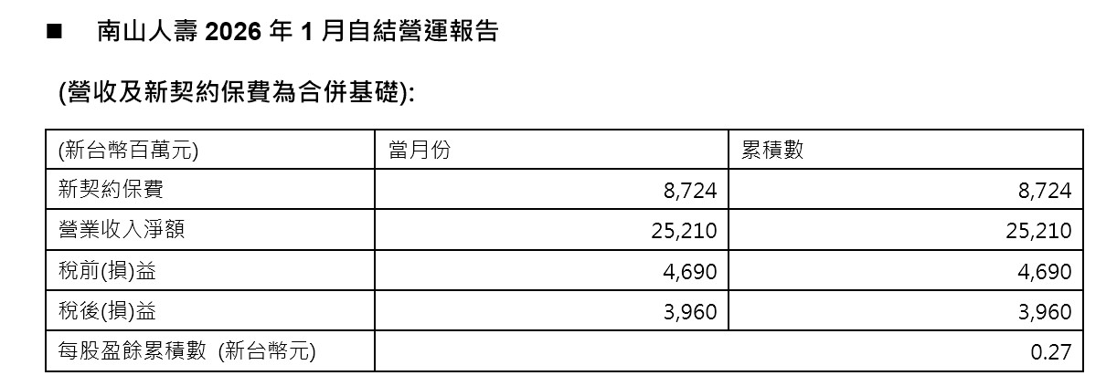 南山人壽1月自結財報出爐,受惠於合約服務邊際(CSM)的累積,保險本業表現亮眼,加上穩定的經常性收益,及掌握市場波段實現資本利得,1月合併損益39.6億元。每股盈餘(EPS)0.27元。