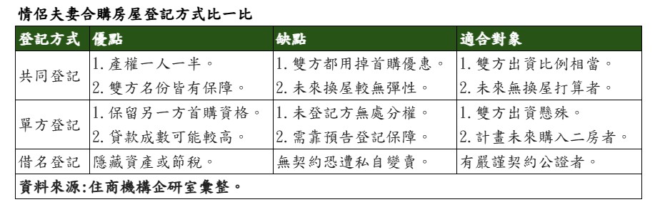 房產若是在婚後購入,賴志昶分析,該房產屬婚後財產,登記在個人名下或聯名登記,雙方有權要求平均分配,對於日後若離異分產的影響較小;不過,若建物採取聯名登記,雖對雙方有保障,但也可能在未來買賣後,用掉兩人的首購優惠,或是影響貸款成數;而若採借名登記,則要小心登記人私下移轉房產變賣,出資方務必保留房屋繳款、稅金等金流紀錄以茲證明。