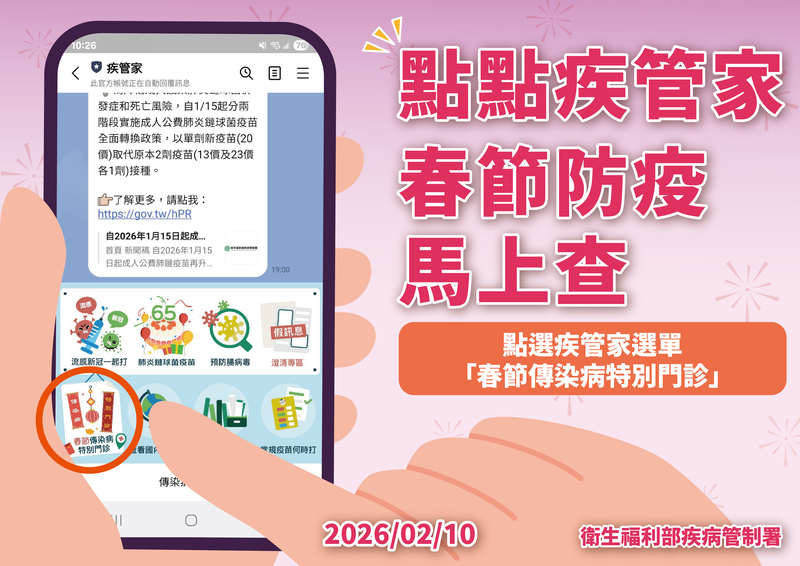 疾管署再次提醒,春節期間不忘防疫,持續做好個人衛生防護,勤洗手、落實咳嗽禮節,出入人多且通風不良場所,或與高風險族群接觸時應佩戴口罩,同時注意飲食與環境清潔,一起平安健康迎接新年。