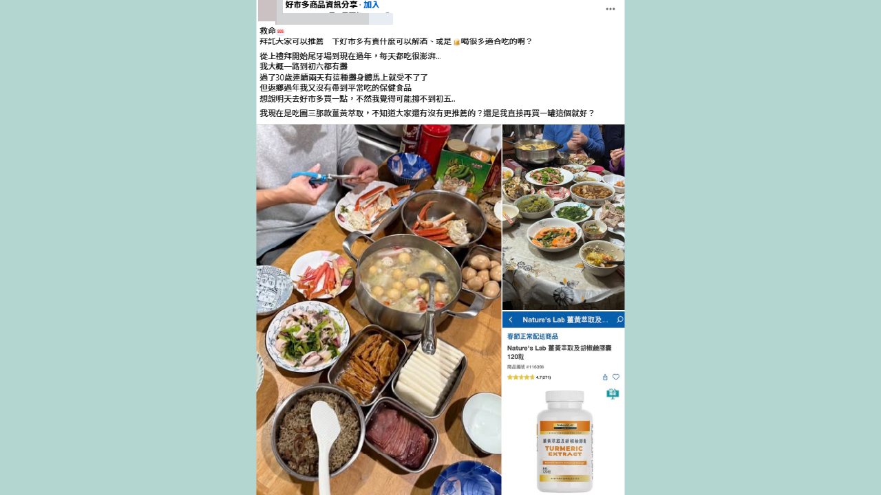 該名網友透露目前正在服用薑黃萃取保健品,詢問是否有更好的選擇。貼文一出立刻引發熱烈討論,不少網友紛紛分享自身經驗。有人推薦科克蘭維生素B群,認為可提高代謝速度、幫助恢復;也有網友大推沖繩薑黃堂系列產品,表示過年期間都靠這款維持狀態。此外,也有網友詢問是否有幫助消化的保健品,坦言這幾天「大魚大肉吃好吃滿」,消化系統也快撐不住。