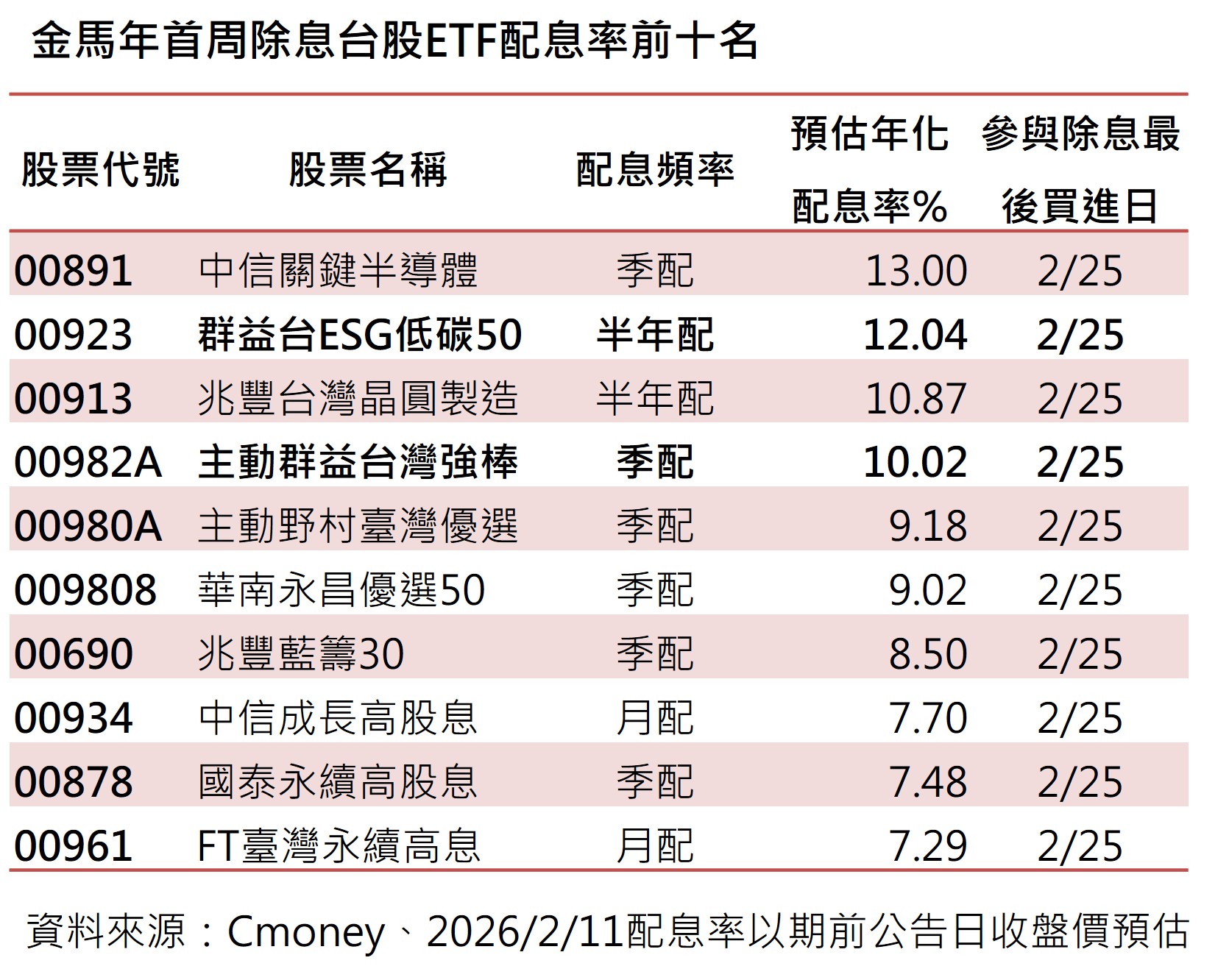 投資人關注的另一話題,就是金馬年首周即將登場的台股ETF除息秀,共計有22檔將登場,其中,新一代市值型配息王群益台ESG低碳50(00923)、主動式台股ETF配息王主動群益台灣強棒(00982A) 本次預估年化配息率均超過10%。