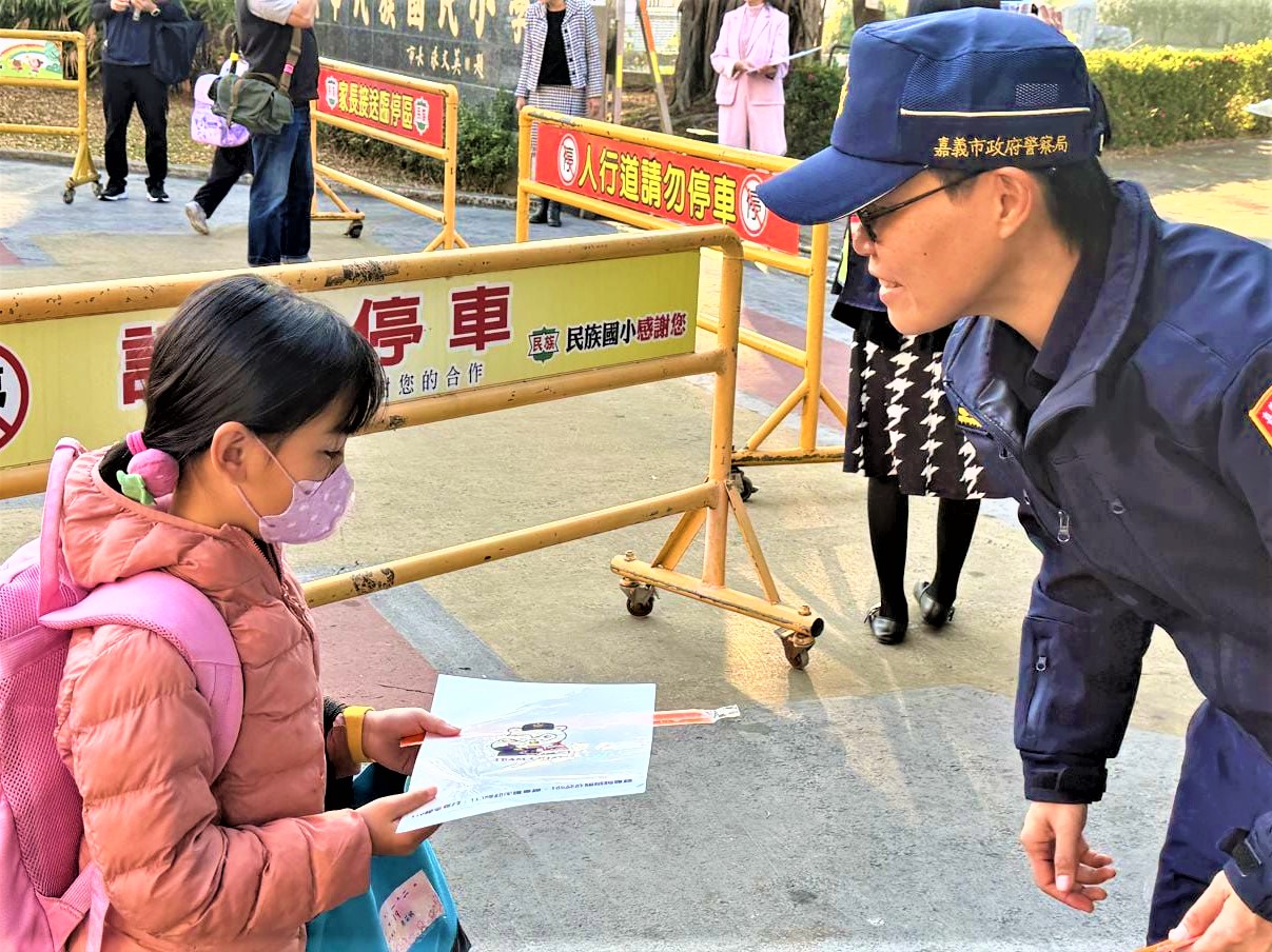 嘉義市政府警察局第二分局為迎接學童回歸校園,避免交通壅塞及事故發生,自開學日起持續執行「護童專案」,除上下學尖峰時段派遣警力於校門口及重要路口進行交通指揮與疏導外,並加強學校周邊治安巡邏,確保學童的生活環境不受干擾;為此,第二分局分局長林思妙於開學日當天特地率員警至民族國小與校方共同迎接學童入學,把握與學童、家長近距離接觸的機會,主動進行反詐騙與婦幼安全宣導,加強宣導「打詐儀表板」各類詐騙案例,針對近期常見詐騙手法,如假投資、假交友及網路購物等詐騙手法,提醒家長務必提高警覺。