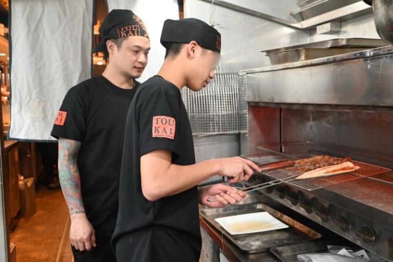 ▲未未少年小丘(圖右)透過勞動力發展署桃竹苗分署「就業力準備計畫」進入東街日本料理成為日料職人,成功脫貧。 (圖/記者蔣彤雲攝)