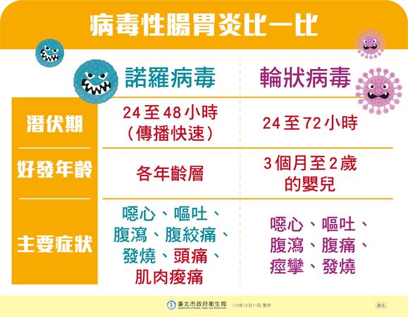 衛生局指出,病毒性腸胃炎傳染力極強,主要經糞口途徑傳播,包含食用受污染食物或飲水、與患者共食或接觸污染物品等。諾羅病毒可感染各年齡層,輪狀病毒則以6歲以下嬰幼兒為主。