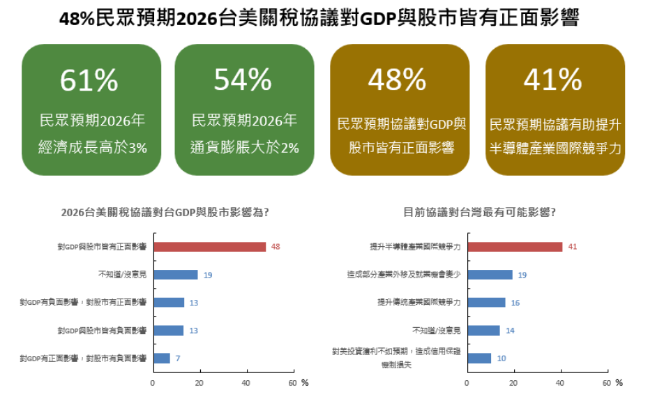 ●61%的受訪民眾預期2026年經濟成長率高於3%,54%預期通膨高於2%: