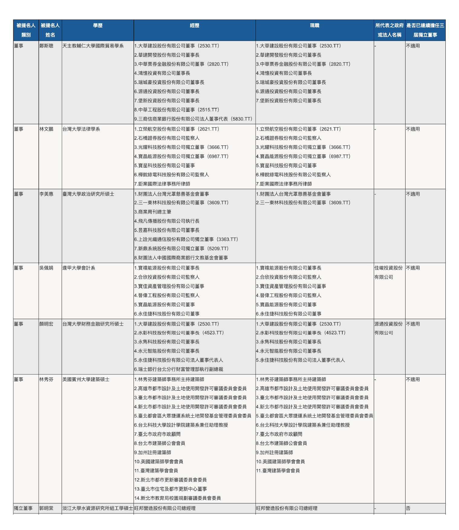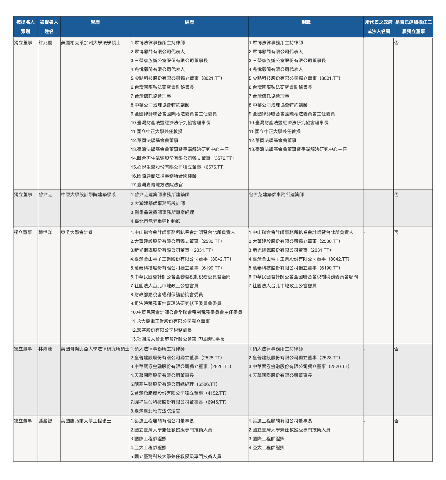 提名人選包括大華建設董事長鄭斯聰、鉅業國際法律事務所律師林文鵬、三一東林科技董事李美惠、寶禧能源董事長吳佩娟、永彰科技董事長顏明宏、建築師林秀芬,以及獨立董事候選人旺邦營造總經理郭明棠、眾博法律事務所主持律師許兆慶、建築師曾尹芝、會計師陳世洋、律師林鴻達、築遠工程顧問公司董事長張盈智等人。