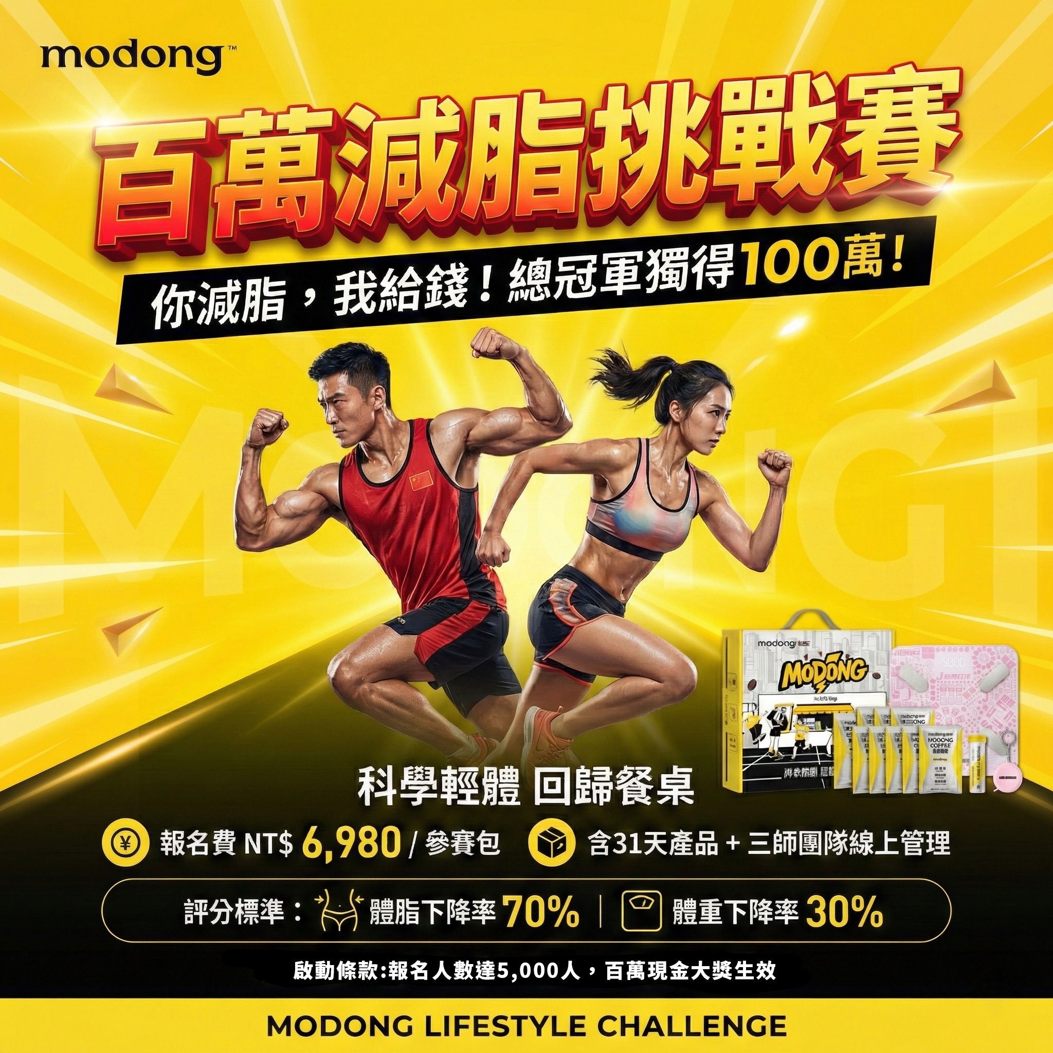 由官方授權單位傑迪斯主辦之「百萬減脂挑戰賽」將於**2026年3月4日「世界肥胖日」**正式啟動報名,名額有限,敬請關注傑迪斯官方網站及社群平台。https://modong.my.canva.site/