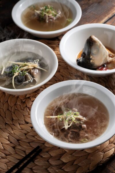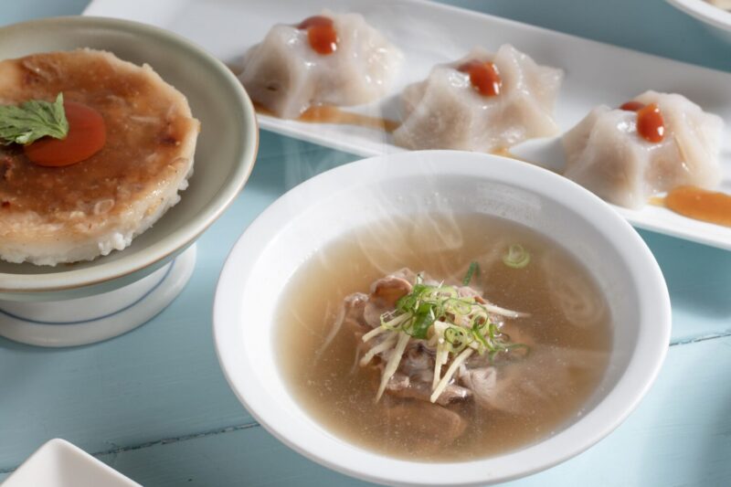 早晨時分,飯店以最具台南代表性的滋味迎接新的一天。首先登場的是台南經典現沖牛肉湯與鮮甜的虱目魚皮湯,滾燙高湯沖淋新鮮牛肉片,粉嫩肉質在湯中舒展,湯頭清甜溫潤,呈現台南清晨的溫柔儀式。虱目魚皮湯鮮香滑嫩,帶著海港城市特有風味,再來一碗香氣四溢的肉燥飯,鹹香醬汁與白飯交織,展現最道地的府城日常。蒸籠裡還有熱氣騰騰的小肉粽與燒賣,台味十足的虱目魚頭料理,無需清晨排隊,在飯店裡即可一次品嚐這些熟悉的經典台南味。此外,餐檯亦備有壽司與暖胃清粥,滿足不同旅客的選擇。喜愛傳統風味者,可來一碗香氣濃郁的鹹豆漿,偏好西式餐點者,也有現做蛋料理與經典西式早餐。現烤麵包區則陳列鬆軟吐司、酥香可頌,以及結合在地特色的虱目魚鬆麵包,成為令人驚喜的小巧亮點。