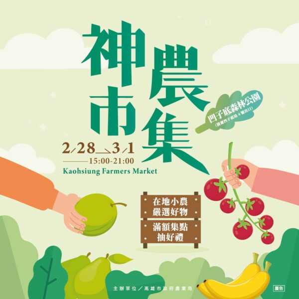 誠摯邀請大家本週六、日(2/28及3/1)下午3點到9點來凹子底公園,品嚐特色料理和選購優質農產,還有大小朋友最喜歡的魔術秀和音樂表演單元。歡迎加入「神農市集」LINE官方帳號(https://lin.ee/123Nr31),或至「高通通-高雄Super Go-高雄市政府農業局」官方粉絲專頁https://www.facebook.com/KSSG12,掌握即時活動詳情。