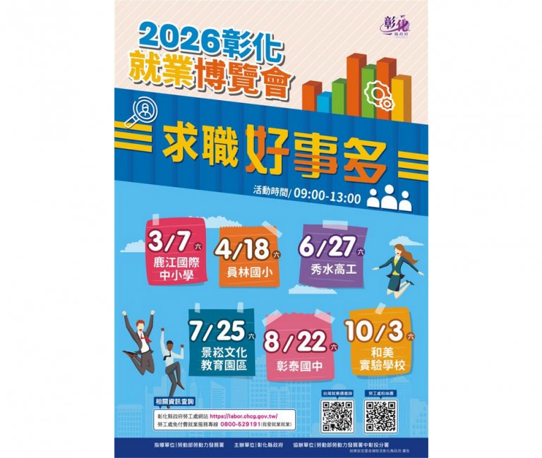 彰化縣政府持續打造友善多元的就業媒合環境,26日舉行宣傳記者會,以「求職好事多、就業選擇多」為主軸,揭開年度就業博覽會序幕。今年規劃6場大型就業博覽會,每場活動預計包含1,000個以上工作機會,提供豐富職缺與多元服務,協助縣內求職及轉職的朋友找到好工作。