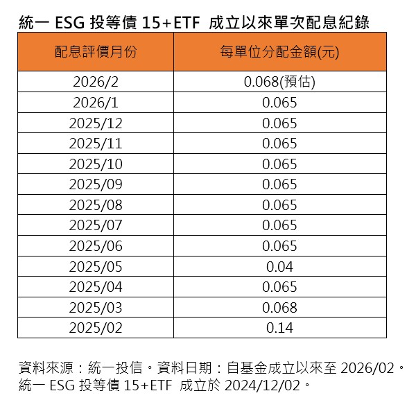 統一ESG投等債15+ETF(00966B)配息初估出爐!預估將配發0.068元,追平成立以來的最高配息數字。以昨天收盤價14.22元計算,單次殖利率約4.78%,年化殖利率約5.73%。
