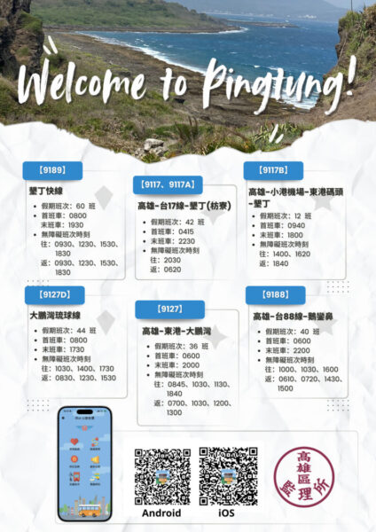 鑒於春節期間墾丁旅遊人潮暴增,高墾線共營中心已規劃高墾公路客運路線加密班次疏運,台灣好行路線「【9189】墾丁快線」每日增班至60班次,「【9127D】大鵬灣琉球線」增班至44班次,「【9117B】墾丁機場快線」每日開行12班次,鼓勵旅客多利用客運路線前往墾丁以避免塞車之苦,並藉由「iBus」App查詢路線班車資訊。前述3條路線均已提供ibon售票及網路預約訂票服務,建議可預先規劃行程並提早購票,確保搭乘順利。