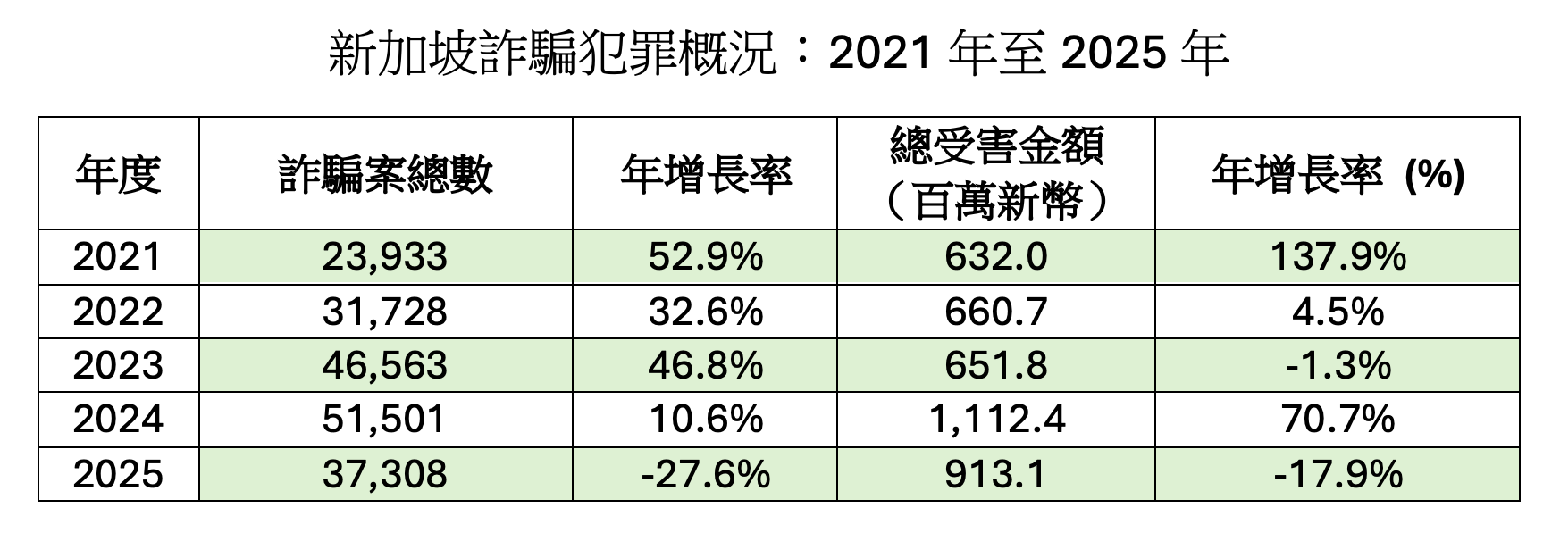 在社區宣導與跨境執法合作下,政策終於出現拐點。2024年詐騙案件數為51,501起,年增幅收斂至10.6%;2025年則出現近年首次「雙降」:案件數下降27.6%至37,308起,總財務損失亦減少17.9%、約2億新幣至9億1,310萬新幣,但仍處於高點,超過2024年前三年平均約2.6億新幣。
