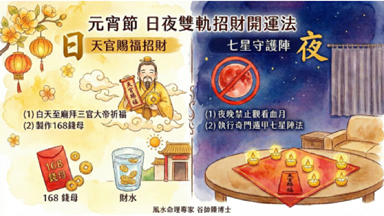 為了讓大家在極端天象中逆勢翻轉,谷帥臻老師特別公開這套**「日夜雙軌開運避險SOP」**。白日天官賜福補財運,晚上拒絕血月紛擾,把宇宙特殊磁場轉化為守護全家人的平安福氣!