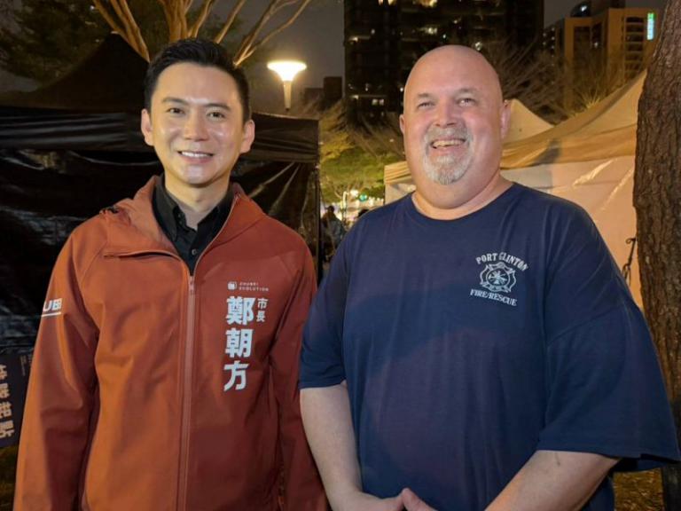 ▲美國柯林頓港市長麥克·斯奈德(Mike Snider)特別蒞臨竹北賞燈,與鄭朝方市長相見歡。(圖/記者蔣彤雲攝)