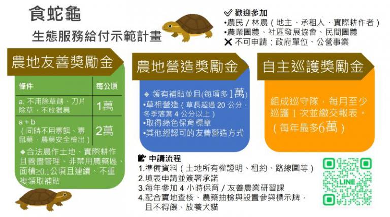 ▲食蛇龜生態服務給付示範計畫懶人包(農業部生物多樣性研究所提供)。