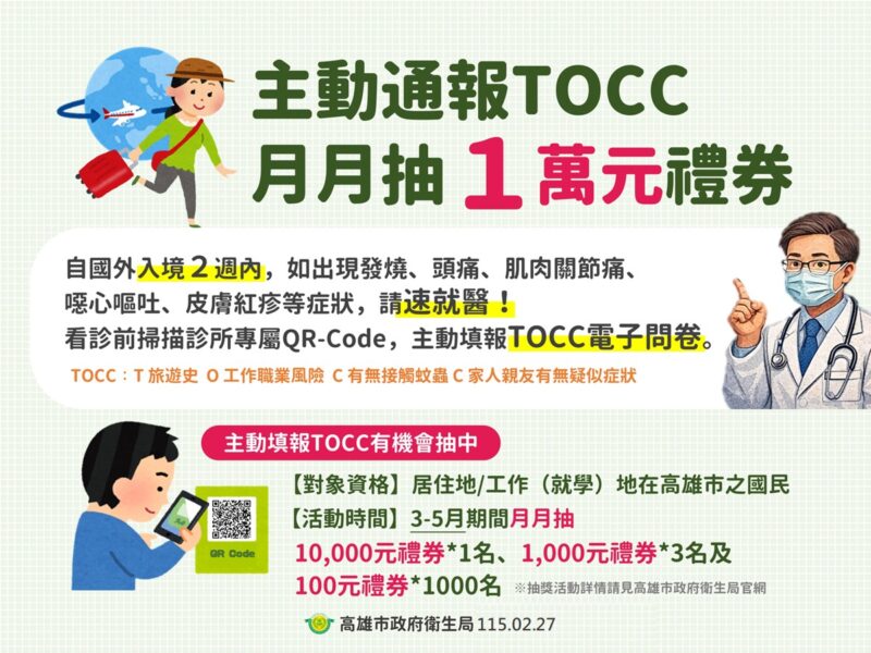 為鼓勵市民共同參與防疫監測,市民朋友於全市登革熱整合式醫療合約院所(https://gov.tw/EE3)就醫時,主動掃碼QR code填寫TOCC,即可參加抽獎,衛生局於今(115)年3-5月期間,每月將抽出萬元禮券1名、千元禮券3名及百元禮券1,000名,得獎名單將於4月8日、5月6日及6月3日公布於衛生局官網(https://gov.tw/1g1)