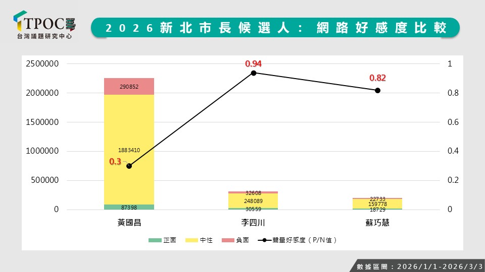 國民黨李四川與民進黨蘇巧慧則展現了截然不同空戰做法。李四川與蘇巧慧的聲量雖分別僅佔11.2%(31萬則)與7.3%(20萬則),但在網路評價上卻相對平衡,好感度分別維持在0.94與0.82的穩健水位。儘管黃國昌不斷主動挑起戰火,甚至對蘇巧慧的營養午餐政策發動猛攻,但從近期民調數據來看,似乎無法明顯動搖其支持度。