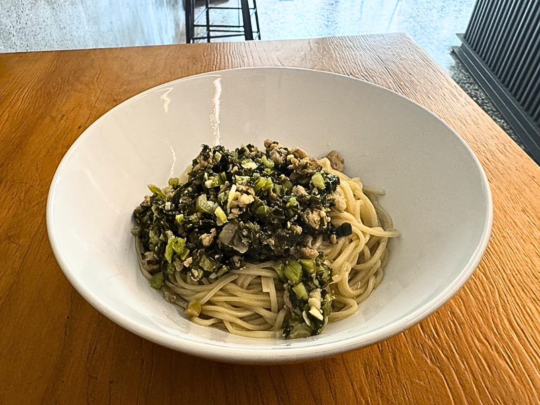 在飲食規劃上,《亨利貞》不只專注於正統義大利式咖啡及精品咖啡,也將日常麵食納入咖啡館的核心體驗。咖啡以 Caffe Espresso 為基礎,展現義大利咖啡、直接的風味本質,同時也提供精品咖啡選擇,讓習慣細品風味層次的客人能品嚐創辦人每日推薦的精選豆種($ 150)。餐食方面,主打雪菜拌麵($ 100)與紅油燃麵($ 90),前者口感清爽、後者香麻帶勁,皆是適合反覆品嚐、不易吃膩的經典麵食,讓咖啡館成為能同時滿足正餐與午後休閒的日常空間。
