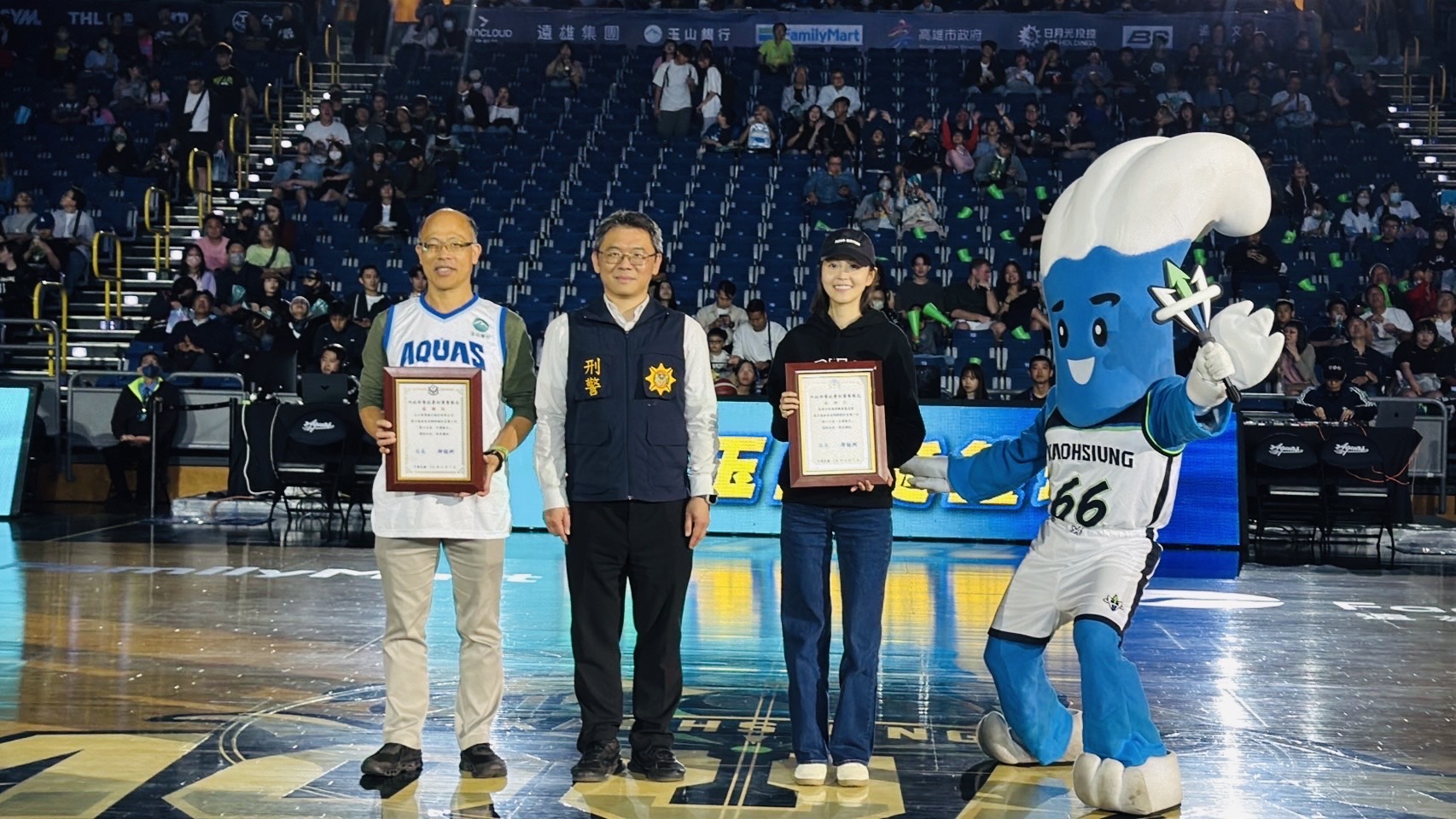 近年詐騙手法日新月異,為提升民眾識詐觀念,刑事警察局與高雄市警局攜手玉山金控及台灣職籃T1聯盟高雄全家海神隊,於今(7)日共同舉辦「全民防詐動起來」活動。刑事局預防科科長莊明雄更受邀擔任開球嘉賓,化身成「防詐、反毒達人」,在熱血沸騰的賽事中,將防詐意識傳遞給每一位球迷。