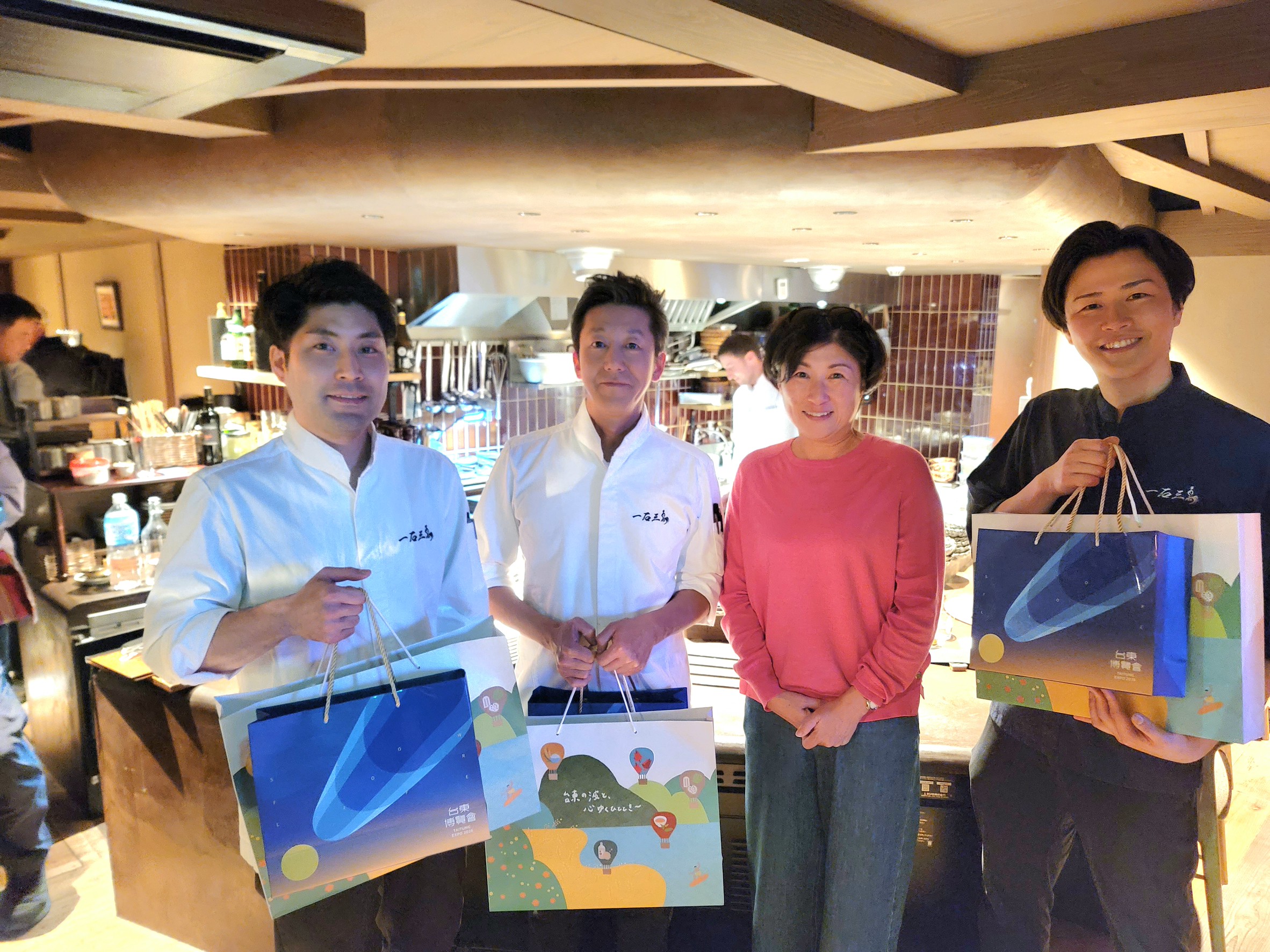 ▲臺東縣長饒慶鈴與日本「一石三鳥」餐飲集團主廚合影交流,並分享來自臺東的特色產品禮盒。/照片由臺東縣政府提供