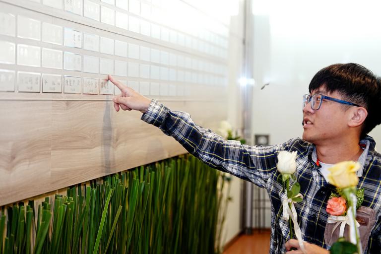 ▲捐贈者家屬沈先生前往「器官捐贈紀念牌」前默禱並獻花,凝視牌位追思摯愛親人,場面溫馨而動人。(圖/中醫大附醫提供)