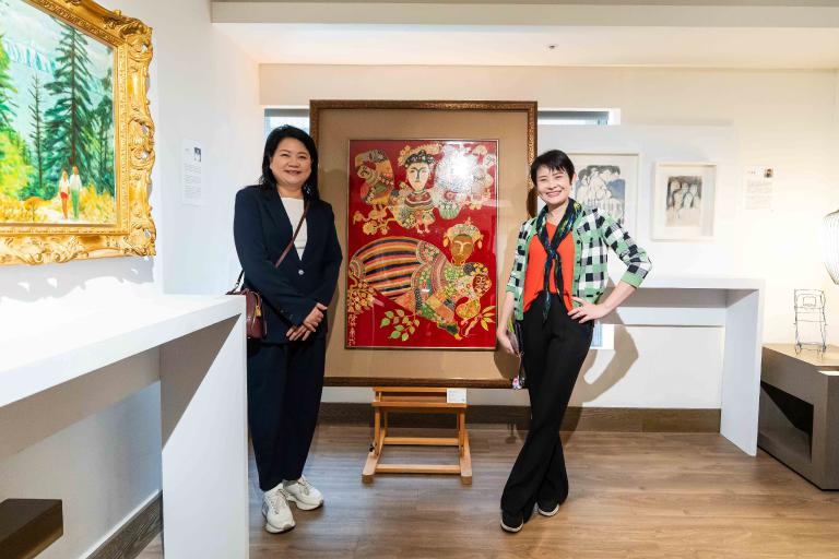 ▲文化部藝術發展司周雅菁司長(右)與畫廊協會理事長陳菁螢(左)參觀尊彩藝術中心展出的洪通作品。(圖/畫廊協會提供)