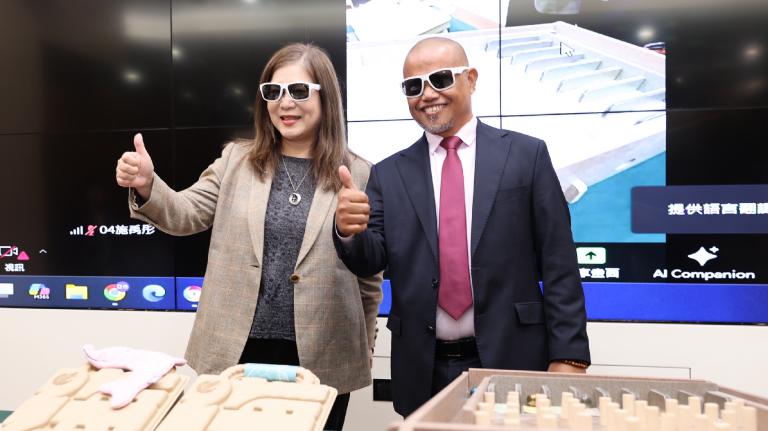 ▲管主委(左)與帛琉農漁業及環境部長Steven Victor一起佩戴海廢回收製造的太陽眼鏡,體驗海廢彈珠台。(圖/海委會提供)